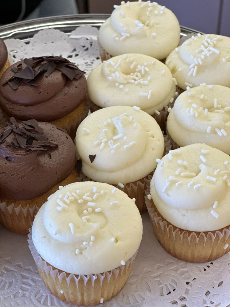 Dark chocolate cake, white chocolate mousse filling with vanilla buttercream frosting